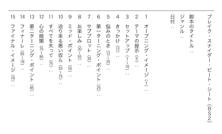 「シド・フィールドの脚本術」の三幕構成を拡充させた構成テンプレートを作成した。